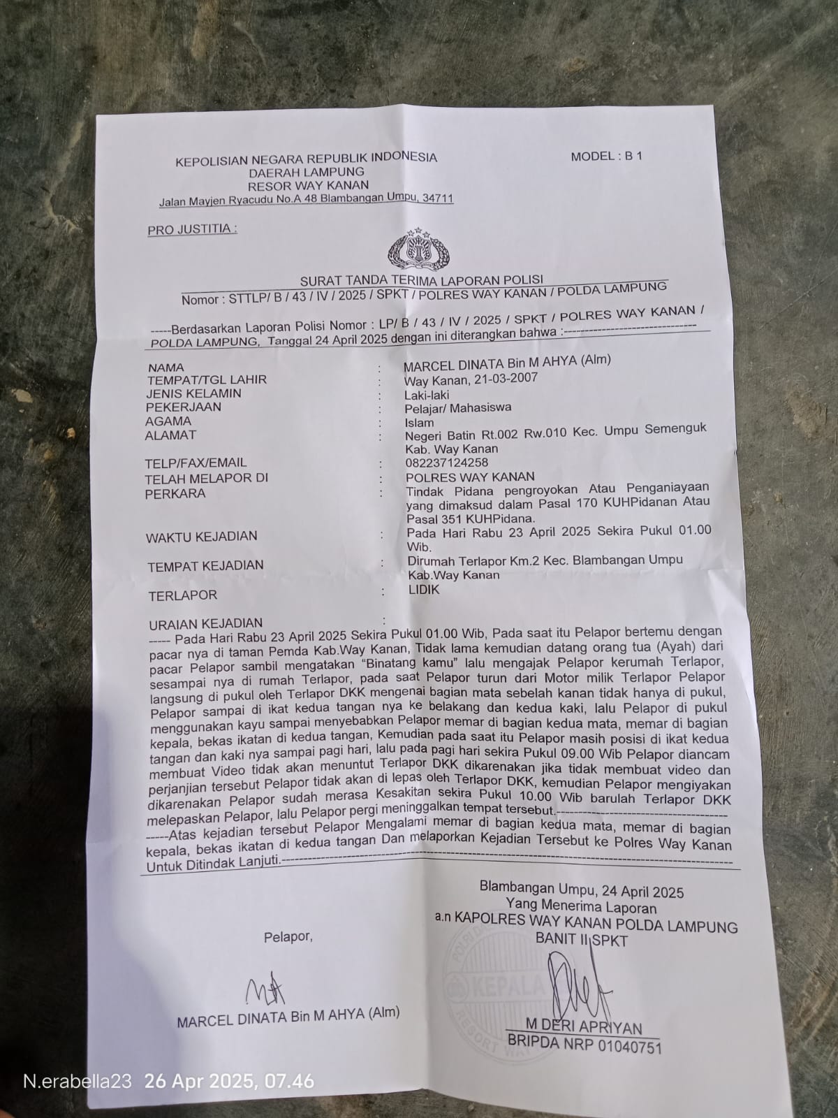 Dan awalnya keluarga korban percaya dengan cerita korban hanya saja karena lukanya cukup parah akhirnya keluarga korban bertanya kepada teman korban yang saat itu menemaninya menemui seorang perempuan di taman sekitar Masjid KM 2 Blambangan Umpu, di mana Dari hasil konfirmasi pihak keluarga kepada teman korban baru diketahui kalau korban telah dianiaya pelaku, tidak terima dengan yang dialami korban akhirnya keluarga korban langsung melaporkan kejadian ini ke Aparat Penegak Hukum (APH) pada Kamis, 24 April 2025. Namun hingga berita ini diturunkan, belum ada langkah nyata dari pihak kepolisian terkait laporan tersebut.