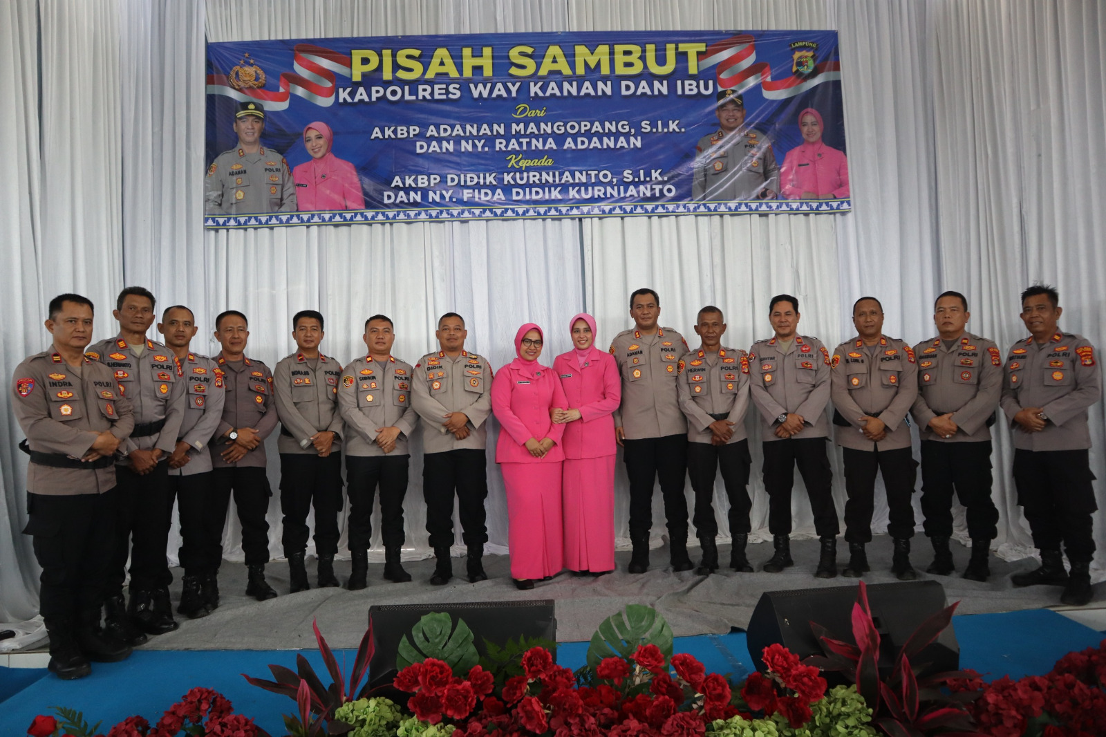 Setelah itu, kegiatan dilanjutkan Pisah Sambut Kapolres Way Kanan di GSG. Lupega (Lusiyanto Petrus Ghalib) dengan dihadiri Bupati Way Kanan, Forkopimda, Komandan Skadron, Komandan Lanudad, Komandan Subdenpom, Ketua KPU, Ketua Bawaslu, Ketua MUI, Ketua PCNU, Ketua FKUB, Ketua ICMI Kabupaten Way Kanan dan tamu undangan lalu pada pukul 13.00 Wib dilaksanakan kegiatan Pelepasan Kapolres Way Kanan AKBP Adanan Mangopang, S.I.K. dan Ny. Ratna Damayanti Adanan Mangopang.